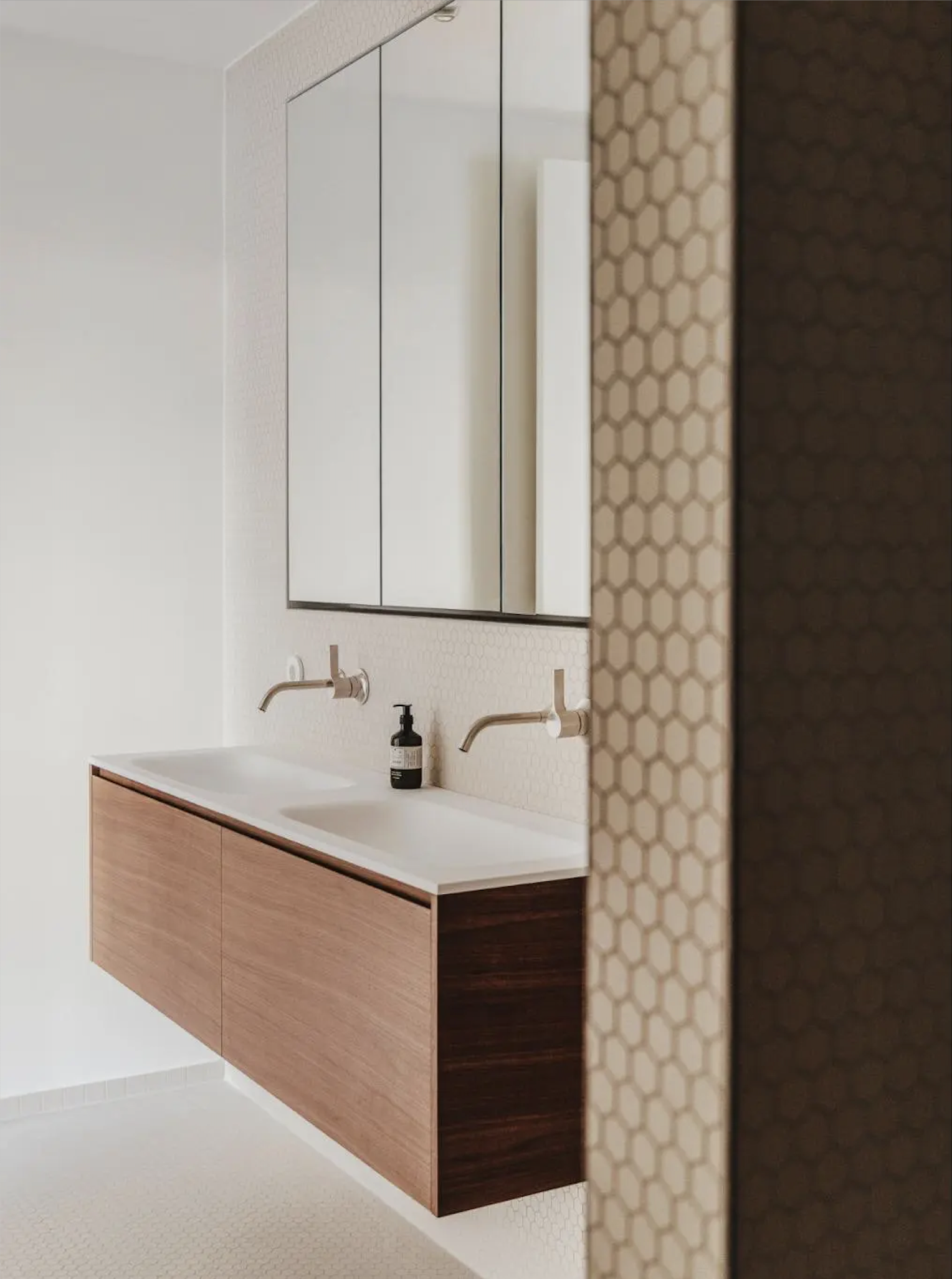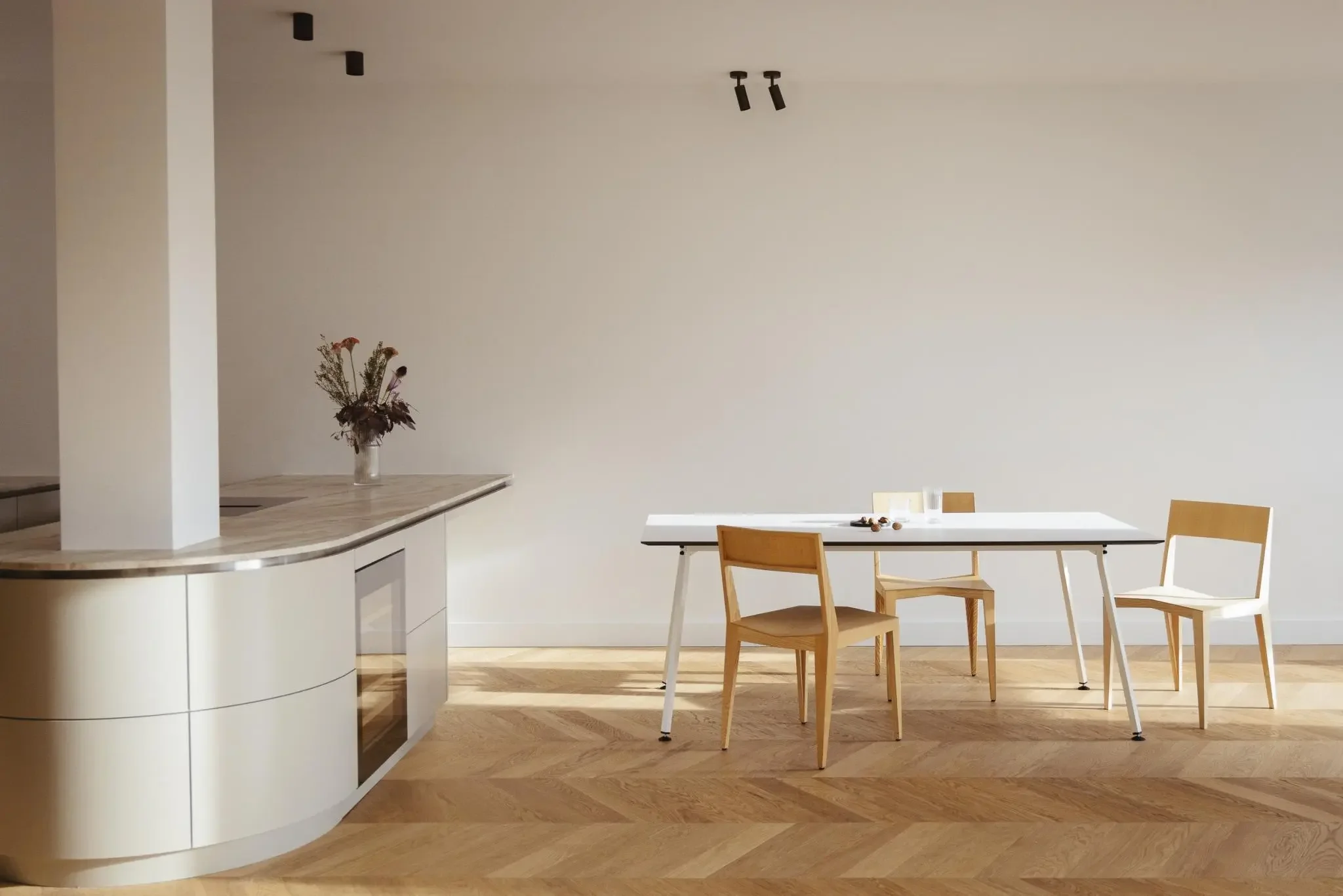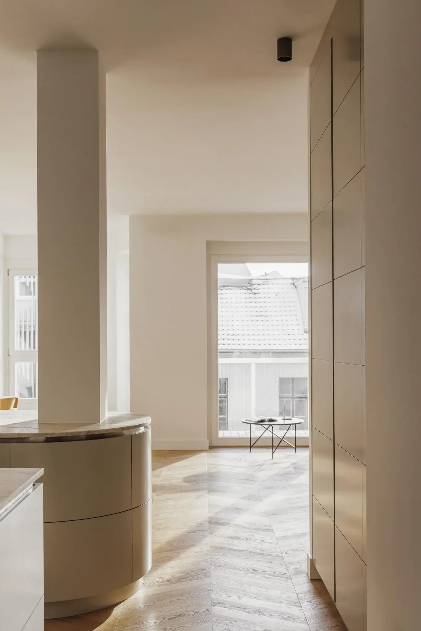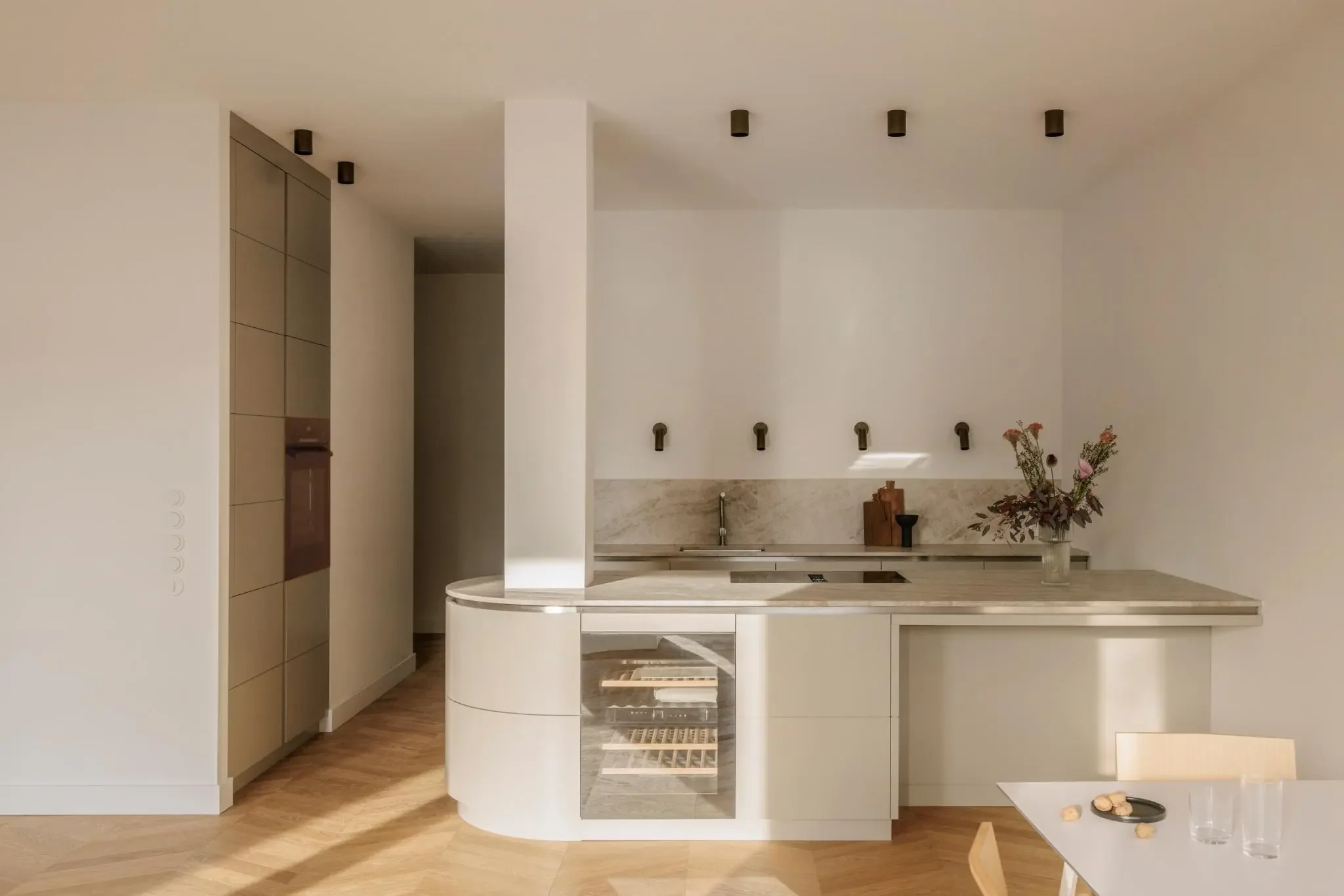Herzstück ist der großzügige Wohn-, Ess- und Küchenbereich mit einer handgefertigten, greige-grünen von decorazioni entworfenen Küche mit Naica-Quarzit-Insel. Geöltes Eiche-Fischgrätparkett, maßgefertigte Einbauten sowie zwei luxuriöse Bäder unterstreichen den hohen gestalterischen Anspruch.