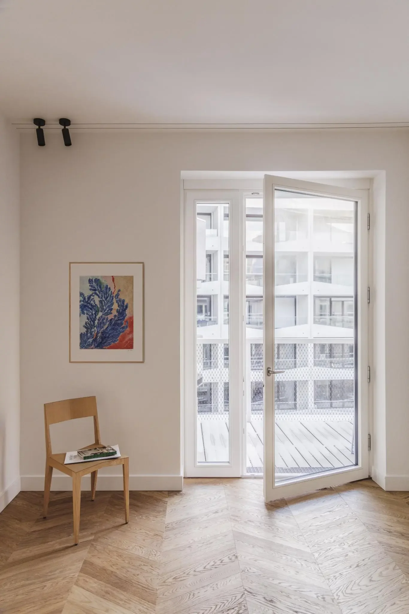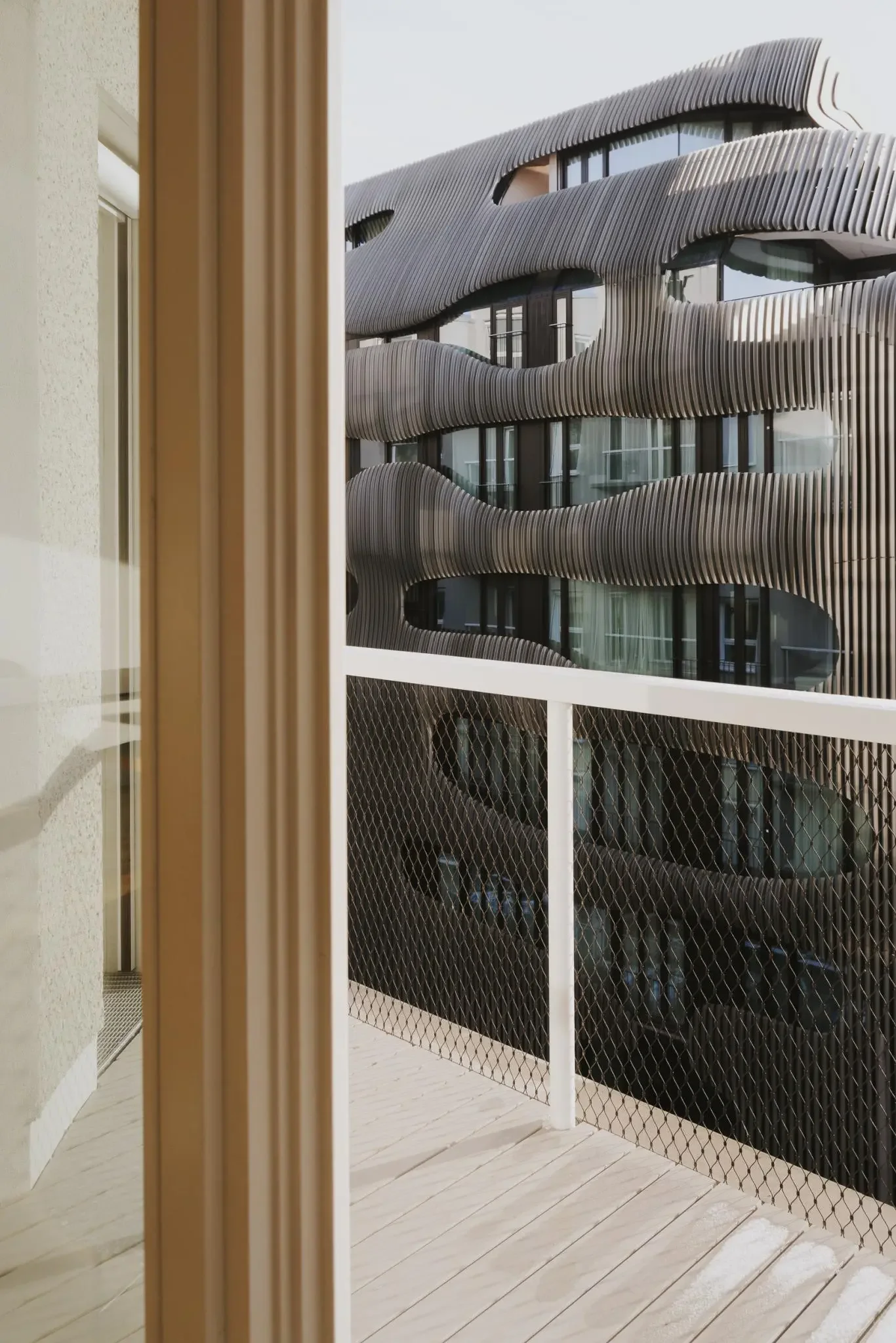 Im „Vert“ am Tacheles, entworfen von Herzog & de Meuron, entfaltet sich auf 124 m² ein Design-Apartment, das architektonische Skulpturalität mit urbaner Eleganz verbindet. Wellenförmige Fassaden, runde Erker und ein spektakuläres Treppenhaus prägen das Gebäude – im Inneren setzen 3 Meter Raumhöhe, bodentiefe Glasflächen und zwei Loggien nach Norden und Süden das Licht eindrucksvoll in Szene.